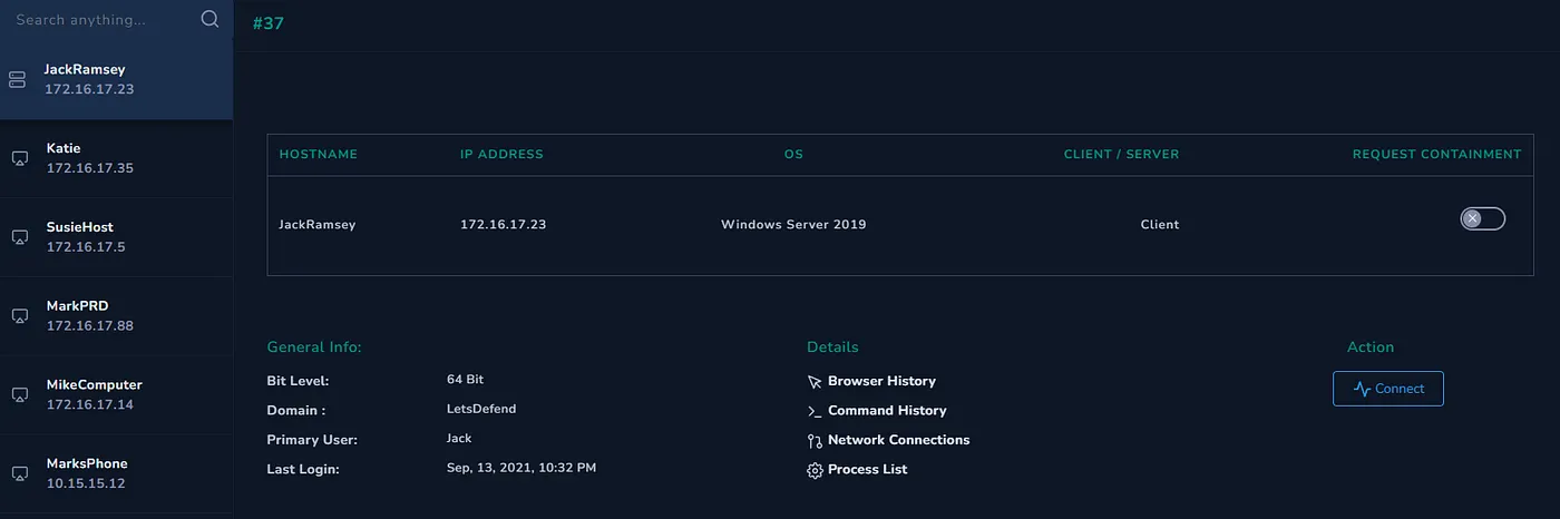 Ayrıca, “Bağlan” düğmesine tıklayıp analizimize orada devam etmek için makinenin kendisine erişebiliriz.